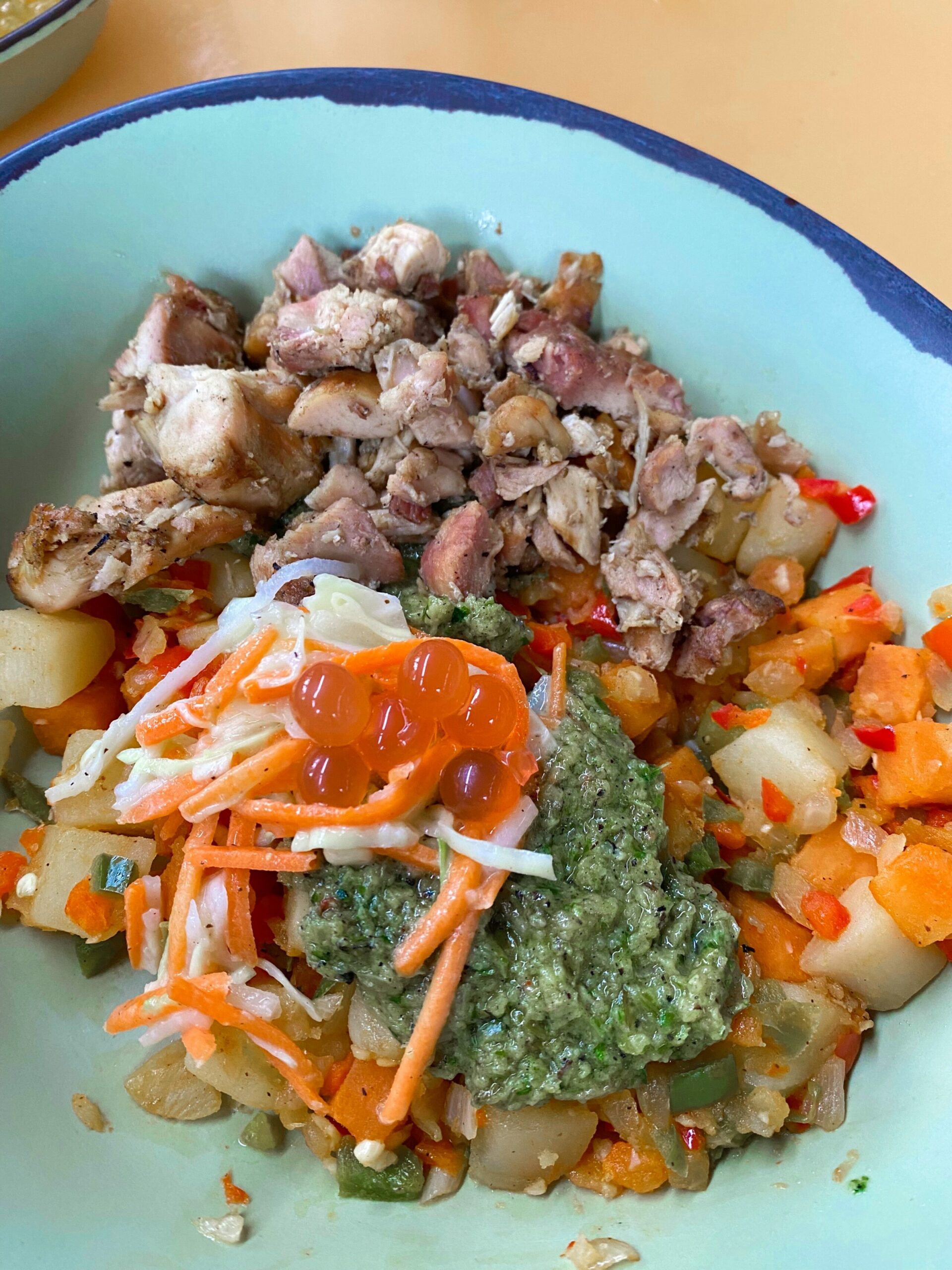 (Chicken, sweet potatoes, coleslaw and chimichurri sauce)